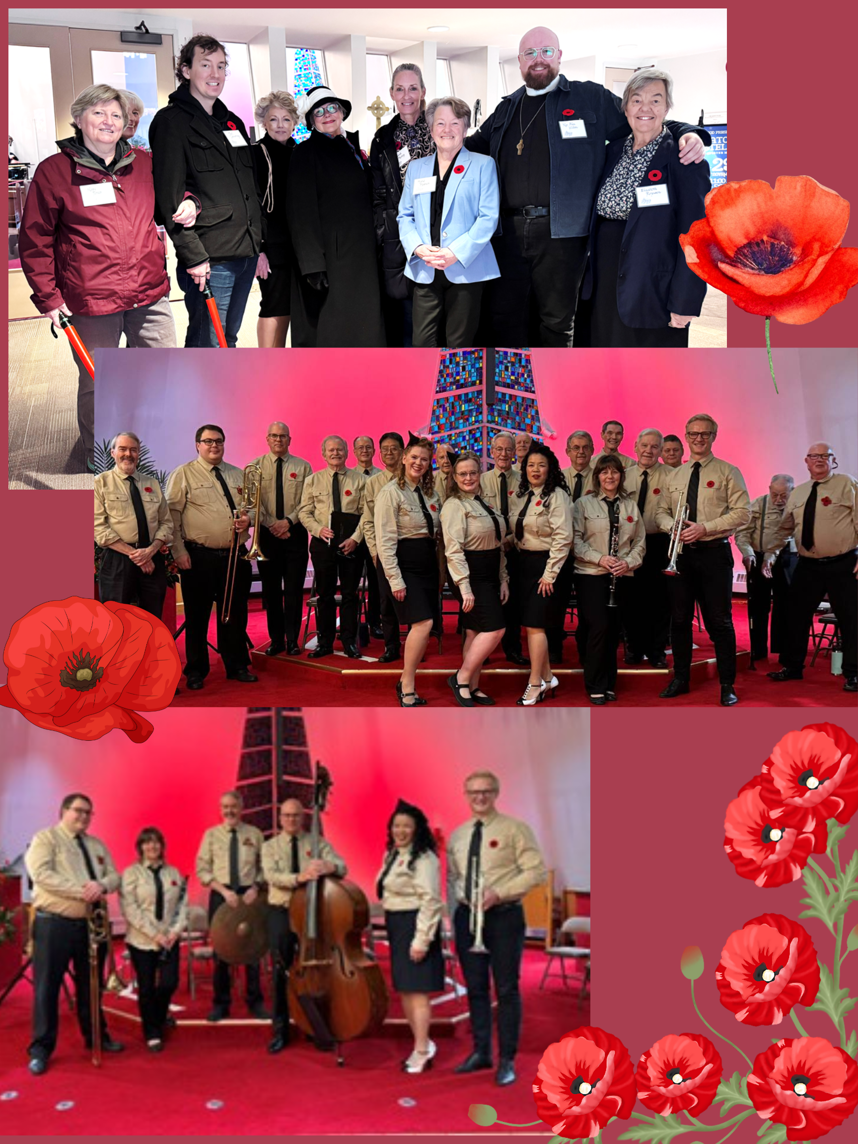 What a moving afternoon was spent at St. Stephen’s church in Ambleside, on Sat. Nov. 8th for the “We’ll Meet Again” concert. I was there to hear the very polished Coast Mountain Men’s Chorus along with professional musicians. Our Karen Lee-Morlang was leading them and of course participating, also there were two other leading singers Melanie Adams and Caitlin Beaupre, together the three of them are the Lady Larks. The five professional musicians who accompanied the singers were Malcolm Aiken on trumpet, Buff Allen on drums, Julie Begg on clarinet & saxophone, Jim Hopson on trombone & tuba and Laurence Mollerup on double bass.